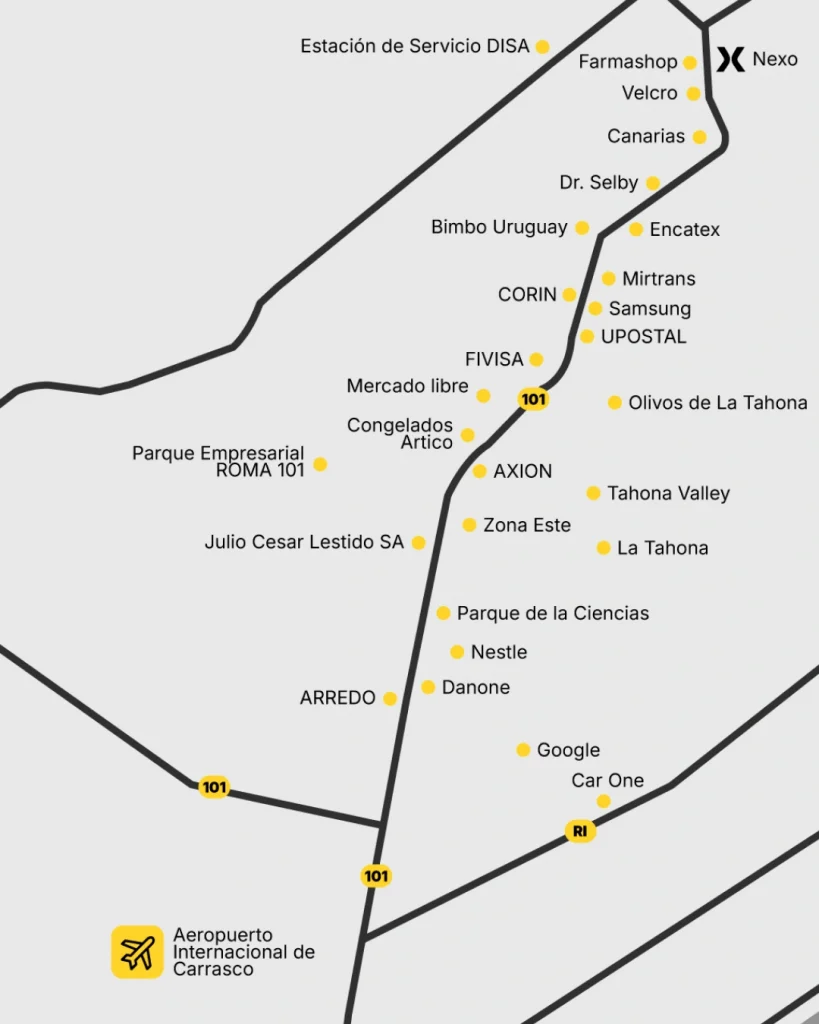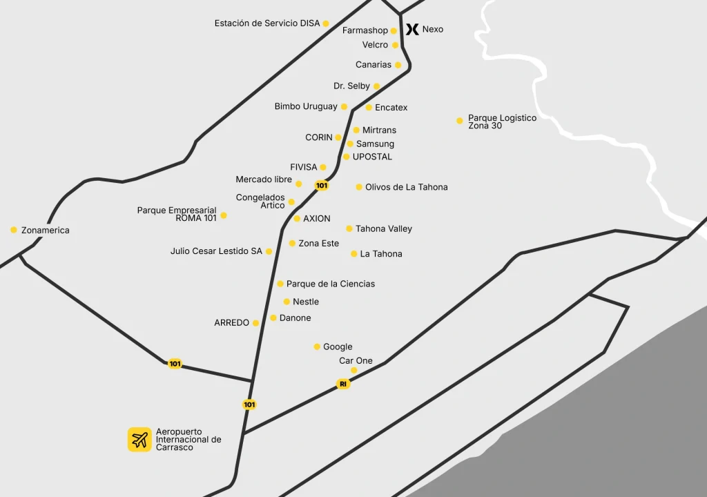 Nuestra ubicación privilegiada en la Ruta 101 km 31,500 nos permite estar en el epicentro de la zona con mayor desarrollo empresarial, logístico e industrial de la última década en Uruguay, a menos de 5 minutos de los barrios privados, a 5′ minutos del Aeropuerto de Carrasco, 30′ del centro de Montevideo y 45′ del Puerto de Montevideo, al contar con una excelente conectividad con Ruta 8 y el Anillo Perimetral.